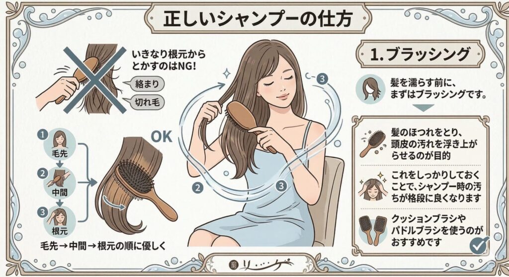髪を濡らす前に、まずはブラッシングです。 いきなり根元からとかすのは、絡まりや切れ毛の原因になってしまいます。毛先 → 中間 → 根元の順に優しくとかしましょう。 髪のほつれをとり、頭皮の汚れを浮き上がらせるのが目的です。これをしっかりしておくことで、シャンプー時の汚れ落ちが格段に良くなります。クッションブラシやパドルブラシを使うのがおすすめです。