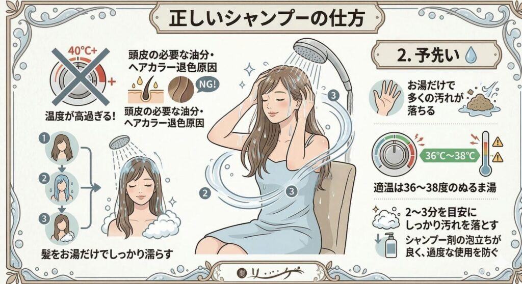 実はお湯だけでも、多くの汚れを落とすことができます。 適温は36〜38度のぬるま湯です。温度が高過ぎると頭皮の必要な油分まで取り過ぎてしまったり、ヘアカラーが退色する原因になったりします。 2〜3分を目安に、お湯でしっかり汚れを落とし、シャンプーの泡立ちを良くする土台を作りましょう。シャンプー剤の過度な使用も防げますよ。