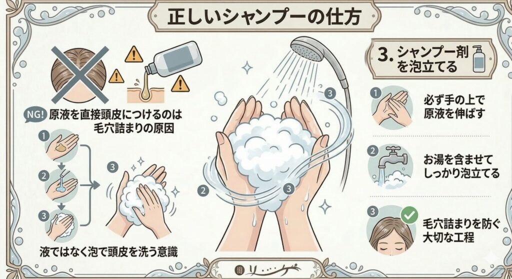 シャンプー剤を原液のまま直接頭皮につけるのはNGです!毛穴が詰まる原因になってしまいます。 必ず手の上で原液を伸ばし、お湯を含ませてしっかり泡立ててから髪に塗布してください。「液」ではなく「泡」で頭皮を洗う意識が大切です。