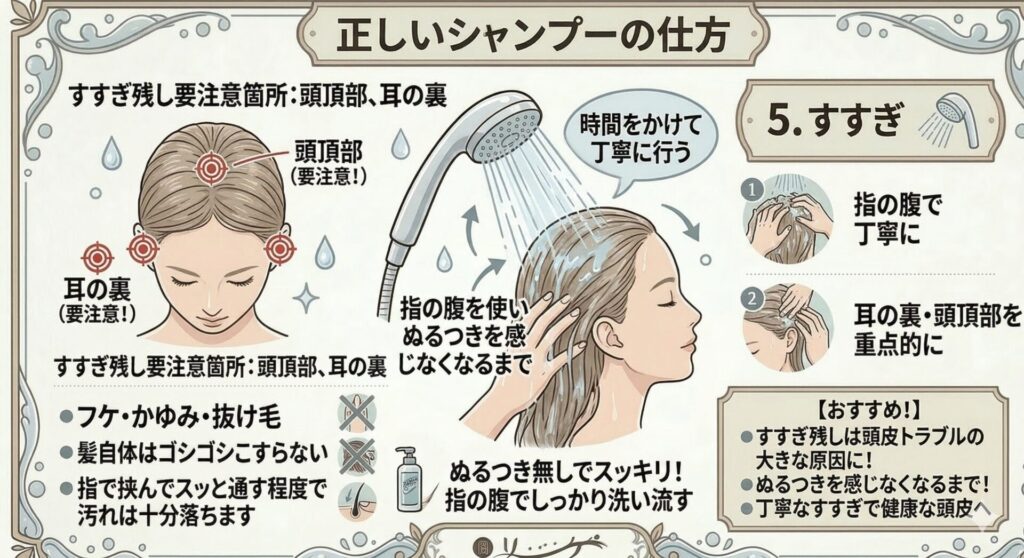 すすぎは、時間をかけて丁寧に行いましょう。 シャンプーのすすぎ残しは、フケやかゆみ、抜け毛といった頭皮トラブルの大きな原因になります。指の腹を使って、ぬるつきを感じなくなるまでしっかり洗い流すことが大切です。特に耳の裏や頭頂部はすすぎ残しが多い箇所なので要注意です。