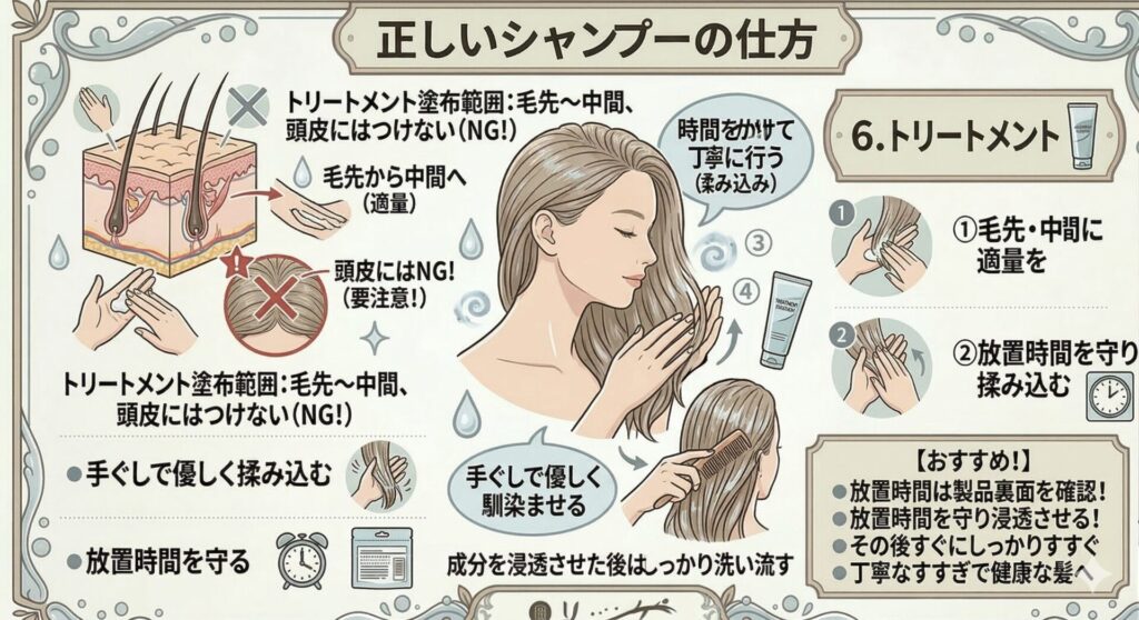 トリートメントは、頭皮につかないよう毛先から中間にかけて適量を塗布します。 手ぐしで優しく揉み込むように馴染ませましょう。成分を浸透させるための放置時間は製品によって異なるため、パッケージの裏面に記載されている時間を守り、その後すぐにしっかりとすすぎます。