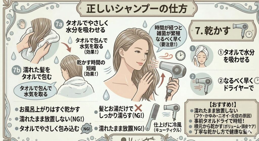 • 重要なのは「しっかりとしたすすぎ」と「シャンプー後の素早いドライヤー」です。お風呂上がりはすぐに髪を乾かし、ニオイの原因となる雑菌の繁殖を徹底的に抑えましょう。