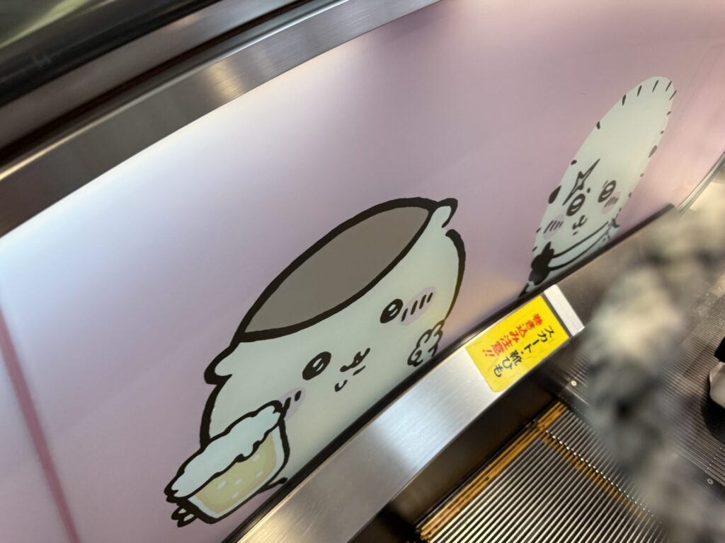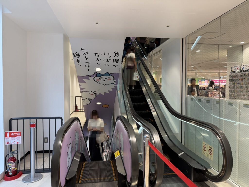 ちいかわらんどのフロア前のエスカレータには、ちいかわたちがラッピングされているので、期待が高まります。