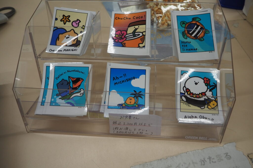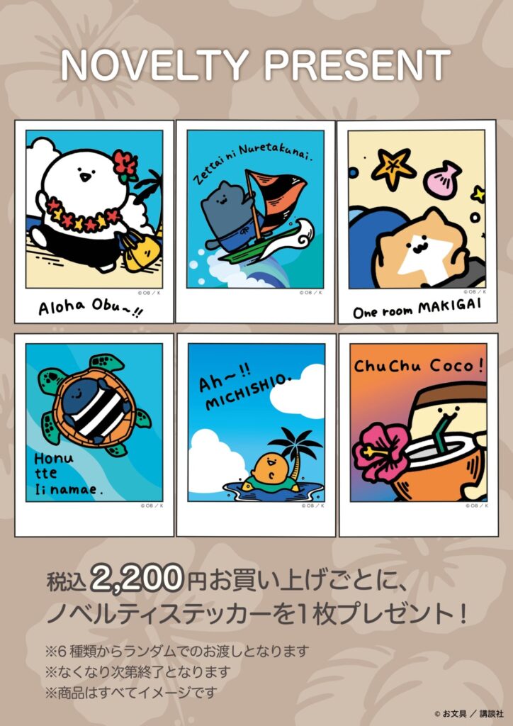 期間中に、お文具さんのグッズを購入2,200円(税込)ごとに、ハワイを楽しむステッカー1枚(ランダム)をもらえます。