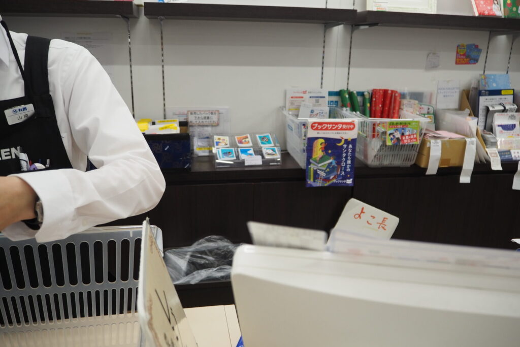 セルフレジでは、ノベルティグッズをもらえない可能性があると思ったので、店員さんのいるレジで会計してもらおうと思ったら、ステッカーが見えています。
