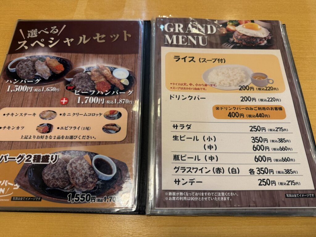 ハンバーグなどのメイン料理に、プラス200円でライス・スープを付けられるので、炭水化物(ごはん)を制限している時などは利用しやすいですね。